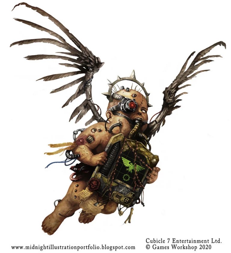 Vat-grown and enhanced with bionics and anti-grav technology they often swoop and chatter about the sepulchers and cathedrals of the Ecclesiarchy and act as sycophants to priests, cardinals and Inquisitors across the Imperium, babbling fanatical rhetorics in their high-pitched, querulous voices.